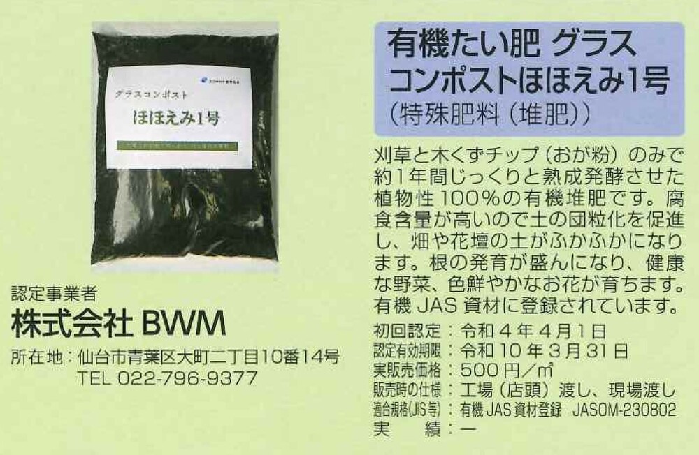 BWM豊里プラントで生産している有機堆肥「グラスコンポストほほえみ1号」につきまして